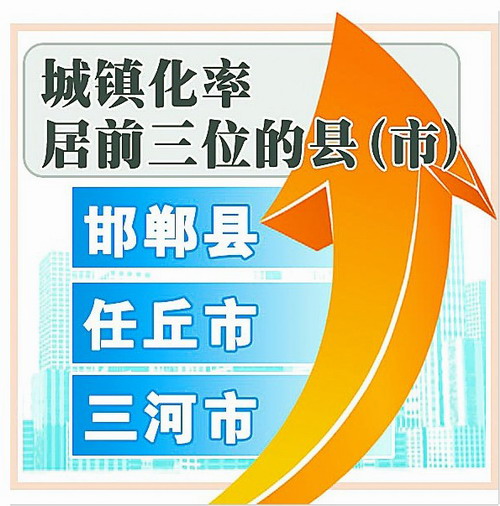 本报9月7日讯(记者段丽茜)从省政府新闻办今天召开的新闻发布会上获悉,我省城镇化进程加速推进,2009年全省城镇人口3076.9万人,城镇化率达43.74%,比上年提高1.84个百分点。136个县(市)中城镇化率居前三位的是邯郸县、任丘市、三河市。