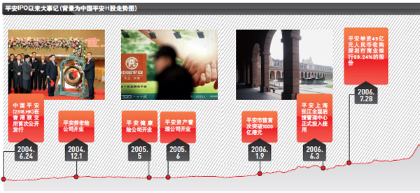 2009年6月12日,中国平安发布公告,与深发展达成《股份认购协议》和《股份购买协议》,平安将认购深发展定向增发的至少3.7亿、但不超过5.85亿股的新股。同时,平安将在不迟于2010年12月31日前收购目前深发展第一大股东新桥投资所持有的深发展16.76%的股份(增发前)。交易完成后,平安合计持有不超过深发展增发后总股本的30%,成为其第一大股东。如果协议最终通过监管层审批,平安牵手深发展,将成为资产规模超万亿的上市公司。更重要的是,这起保险业和银行业的跨界联姻,将真正弥补平安这个保险起家的金融控股集团长期梦寐以求的银行短板。