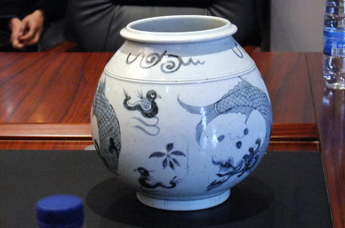 发布会上展示的青花鸳鸯鱼化龙三文罐,造型古朴,釉色青白,青花发色略暗灰,无明显过渡,胎底呈火石红,鱼化龙寓意独特,画法自然,鸳鸯画法简练生动,整体造型浑厚古朴,具典型元代风格。估价在5000万人民币。
