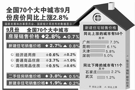 调查显示,9月份,全国70个大中城市新建住宅销售价格同比上涨2.7%,环比上涨0.8%。